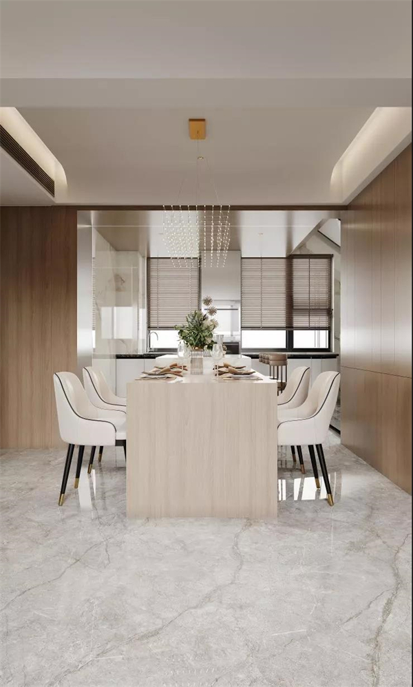 从装饰到陈列,从色彩搭配到材质选择,这一小小餐厅都给人一种优雅从容的感觉。超耐磨瓷砖·爱尔兰灰,纹理自然丰富,密缝连纹铺贴让空间看起来一气呵成,逼真还原天然石材的柔与线条美,想象一下家人在这里享受一顿饭,应该是轻松愉悦的吧。
