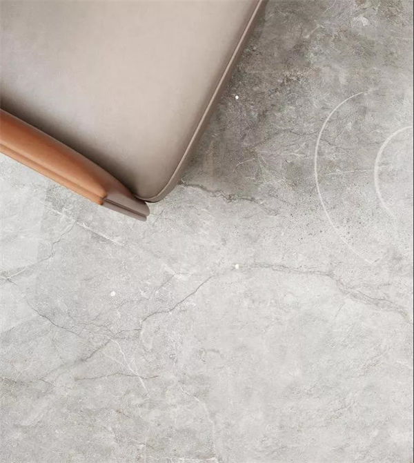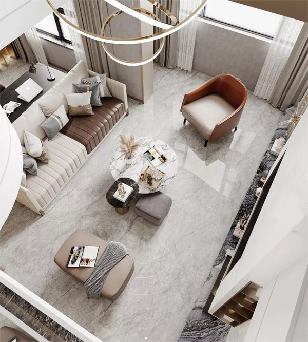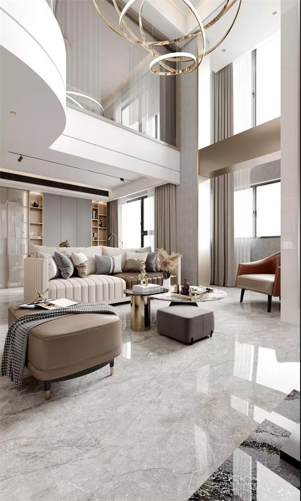 客厅是一个家风格的把控者。超耐磨瓷砖·爱尔兰灰的加入,更是为家居整体氛围定下基调,自然丰富的纹理通过密缝连纹铺贴给人以完整感。挑高式客厅的垂落灯饰、灰白色软装与地面的高级灰瓷砖遥相呼应,透露出张弛有度的力量美学。
