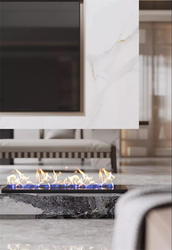 设计师根据业主需求选择了木色跟纯白色相互融汇的现代轻奢风格,会客区用时尚简洁的石材纹理茶几配上超耐磨瓷砖·爱尔兰灰,高级灰瓷砖与白色饰面呈现鲜明的层次感。